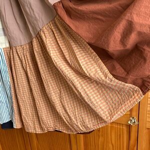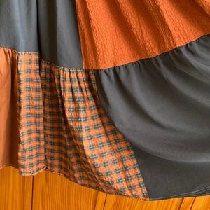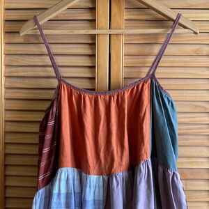 La Reunion spaghetti strap patchwork dress is size XS with solid and plaid fabrics in muted shades of blue, navy, orange, green, rust, black, cream, purple, brown.