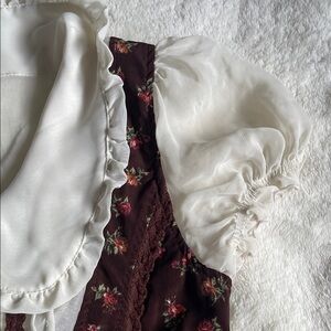 Charming mini dress with floral pattern. Features a white collar and puff sleeves. Perfect for a cute, vintage look.