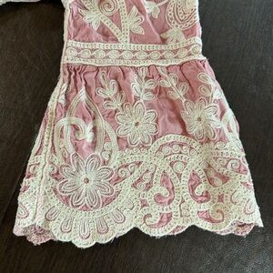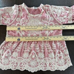 Chic pink blouse by Kindred featuring elegant cream embroidery. Perfect for any occasion. Gorgeous flutter sleeves. See photos for measurements. Shirt is fitted across chest.