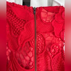 Bold red mini dress with floral lace overlay. Sleeveless and chic design. Perfect for standout style.