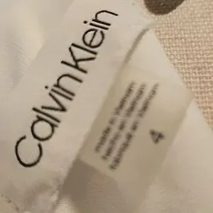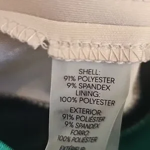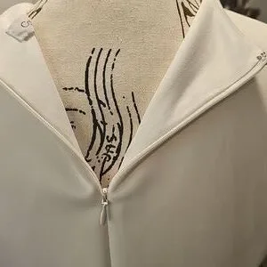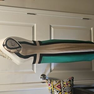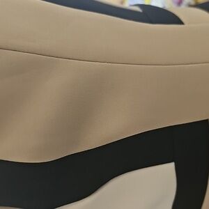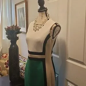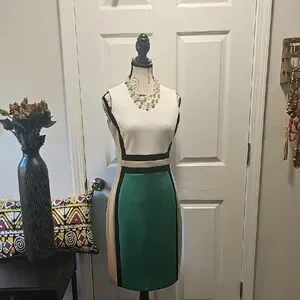 Chic pencil skirt/dress by Calvin Klein. Features bold green and cream panels. Perfect for a stylish and stand-out in the crowd look. Add black, white, or tan heels, and you're good to go! A little black bolero jacket or velvet wrap scarf would be a finishing touch. 23 inches from waist to below knee. 26-inch waist.