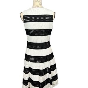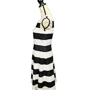 A truly beautiful dress for a special occasion. Black and white stripe with eyelet design. The skirt has a slight flair at the bottom for true Hollywood glamour. Measurements in photos please let me know if you have any questions. This is in excellent Preloved condition.