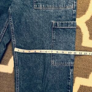 Stylish and fun great like new blue denim jeans. Almost like painters pants. Patch pockets on front side and back. Comfortable but still feels like denim. Perfect for casual wear.