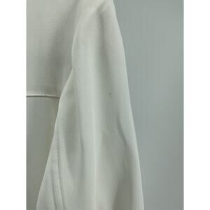Khaite Midi Length White Acetate Dress Size XS: three-quarter sleeve with collar, button closure at front, measurements: 18 inch bust width x 16 inch waist width x 44 inch length. Note: discoloration on the back right sleeve near the cuff, small discolorations on the upper right sleeve and both front shoulder areas, and the upper back below the collar.
