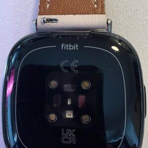 Track fitness with the Fitbit Versa 4. Features a sleek black face and beige strap. Includes charger and original packaging. Excellent condition