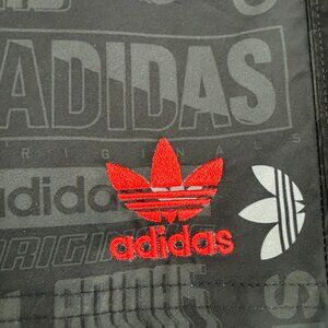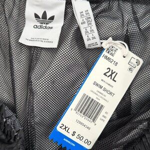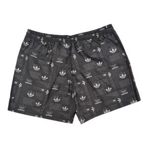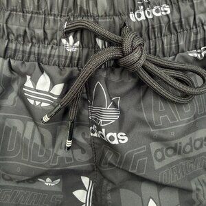 Brand new Adidas Originals swim shorts, size 2XL, new with original tags attached. Features an all-over Adidas logo print in black and gray with a small red logo detail. Elastic waistband with adjustable drawstring for a comfortable fit. Mesh lining inside for support and quick-dry performance.