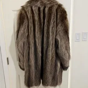 This coat was pre-owned at the time of purchase. The armpit lining required repair and has been carefully hand-sewn. The lining throughout the rest of the coat is intact and shows no additional damage beyond the repaired area. The coat is odor-free and comes from a smoke-free home and environment. There is no fur shedding or damage to the exterior; the fur remains in great condition. The interior shows minor flaws consistent with age and wear but has been repaired as noted.