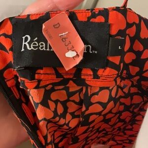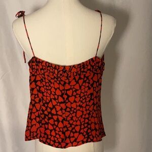 Realisation Par Ana silk top, printed 100% silk with a pattern of black with red hearts. Ruffled Sweetheart neckline to a tie front. Gathered at chest. Adjustable shoulder ties. Full zippered back. Dry cleaned and ready to go!