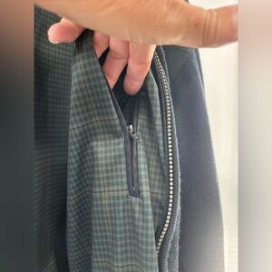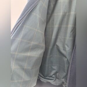 Ultimate Foul-Weather wool sweater jacket in black by Orvis. Full zip with plaid lining. Mock neck with stand up collar. Ribbed cuffs and hem. Has inside zippered pocket. Size XL.