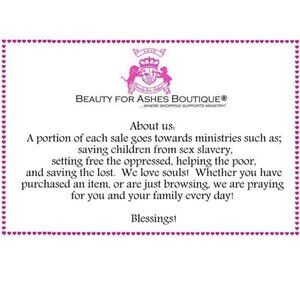 Please note: Beauty for Ashes Boutique® and Beauty for Ashes® carries t-shirts, worship flags, clothing, jewelry and accessories; many with our trademark brand name 'Beauty for Ashes' - which means God will restore Beauty in place of life's ashes - Isaiah 61:3. None of our items carry literal ashes. Instead, our items carry the blessings of God representing restoration and divine destiny for each individual.