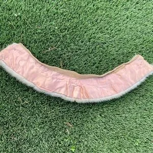 A slightly curved piece measuring 21.5”long on the neckline edge and 4” wide.