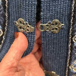 This is a beautiful vintage Nordstrikk Norwegian pure wool cardigan with traditional geometric patterns and ornate metal clasps. Pristine vintage condition. Fits like a Large but no size noted, See measurements. Made in Norway.