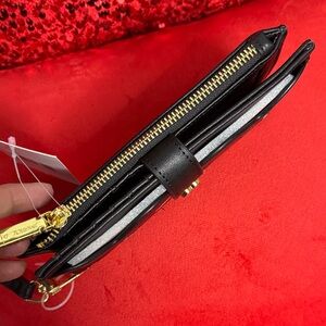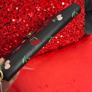 Stylish wristlet with cherry design. Black base with red and pink accents. Gold-tone hardware adds elegance. 14 Credit card 💳 slots, 4 bill 💵 slots, 1 exterior slots and 1 large coin 🪙 slot. Beautiful and New with tags.