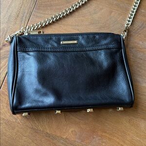 Stylish black crossbody bag by Rebecca Minkoff. Features a gold chain strap and sleek design. Perfect for any occasion. Good, used condition.