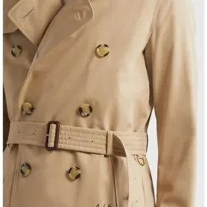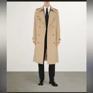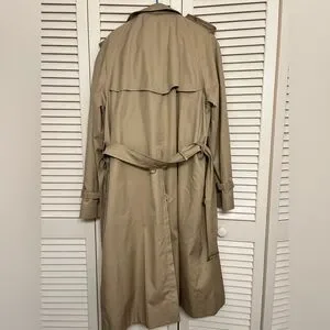 Elegant Burberry trench coat in tan. Features classic design and button details. Includes removable wool liner