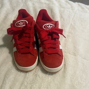 Never worn!! Men’s 8 but fits woman 9 1/2 Vibrant red Adidas Campus sneakers with classic white stripes. Ideal for everyday style.