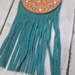 Elegant leather keychain with intricate floral design. Features teal fringe and tan leather. Adds charm to any accessory collection.
