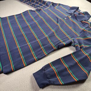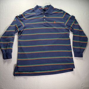 This Polo Ralph Lauren Men's Large Shirt features a stylish rugby collared design with a spread collar and button closure. The shirt is made from soft cotton knit fabric in a classic striped pattern of blue and green, making it perfect for casual occasions in the winter, fall, or spring. With the signature Polo Ralph Lauren logo accent, this shirt offers a comfortable and regular fit, perfect for a 90s-inspired look. Machine washable for easy care, this long sleeve polo is a timeless addition to any man's wardrobe.