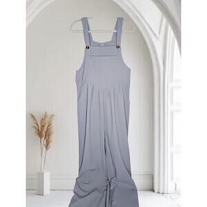Cute Palazzo style overall jumpsuit romper for women size large. The color is either a light gray or beige, depending on your color perception. It looks beige to me.or dark tan. Either way it's a nice neutral color. Huge pocket on front bib and side pockets.