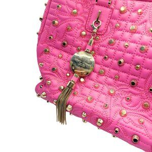 This pink handbag is crafted from Baroque-style quilted leather, accented with gold stud detailing for a bold finish. Rolled leather top handles with iconic Greca links add a signature touch, while the Medusa Head charm with chain tassel lends an instantly recognizable accent. A top zip closure opens to a spacious interior finished with a Baroque print, offering both style and practicality for everyday essentials.