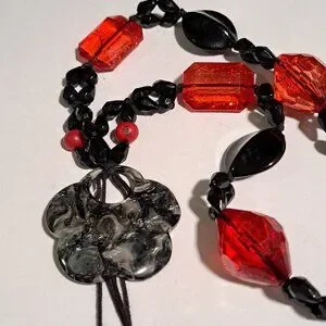 Chunky red and black beaded necklace with flower pendant