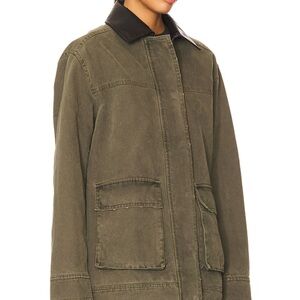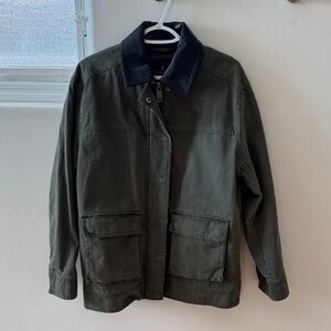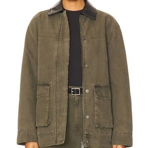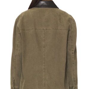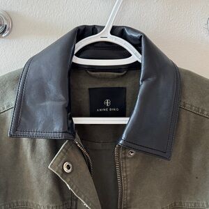 Chic olive utility jacket by Anine Bing. Features a stylish black leather collar. Ideal for versatile wear.