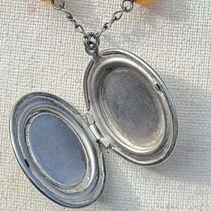 Silver-tone locket necklace with an oval turquoise pendant. Accented by orange beads. Stylish and unique.