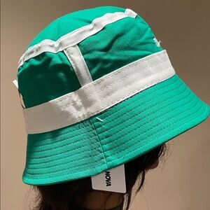 Bold green bucket hat with edgy embroidery. Perfect for making a statement.