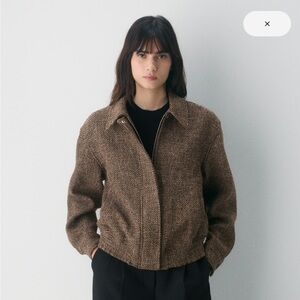 This is a lined bomber jacket with a classic fit. It’s cut from a softly structured tweed boucle with a textured feel. This fabric is sourced from a premier Portuguese mill.