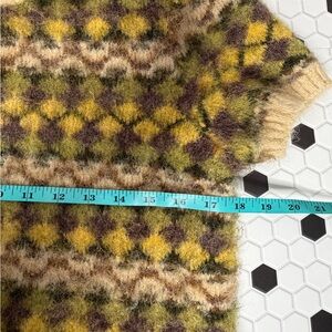 Cozy meets chic with this Zara fuzzy knit sweater top featuring a gorgeous retro-inspired geometric / Fair Isle pattern in earthy tones of olive green, mustard yellow, cream, and brown. Ultra-soft with a plush, textured feel, this short-sleeve sweater is perfect for layering or wearing on its own during transitional seasons.