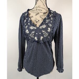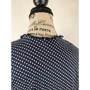 Title: Lucky Brand Womens M Blouse Boho Cottage Navy Blue Polka Dot Ruffle Cotton Top