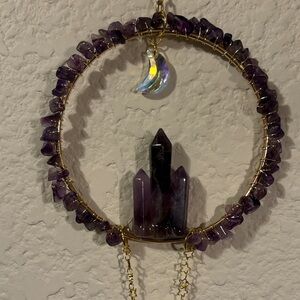 Handmade genuine Amethyst chips wire wrapped with 3 Amethyst towers and crystal dangles to catch the light . Moon prism adds a mystical touch! Amethyst brings calm protection, emotional balance and abundance. Crown chakra stone. Brings rainbows!