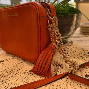 Michael Kors | Jet Set Saffiano Leather Crossbody Bag in deep orange. Features gold chain strap and tassel detail. Perfect for adding a pop of color.
