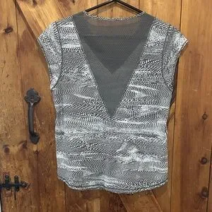 Chic black and white blouse with a modern pattern. Sleeveless design for versatile styling. Cool mesh V in front and back. My best guess would be a 6-8. The pull tag has been ripped out. Ptp is 19”