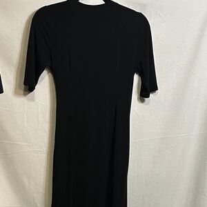 Elegant black dress with an wrap design. Features a wrap front and elbow-length sleeves. Ideal for any occasion.