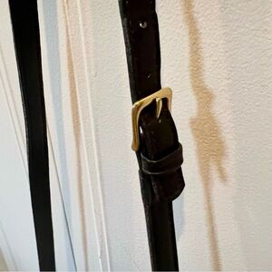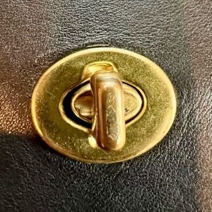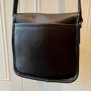 Stylish black leather crossbody bag. Features a gold turn-lock closure. Vintage Authentic Coach. Good condition. Approximately 7x7x3 inches.