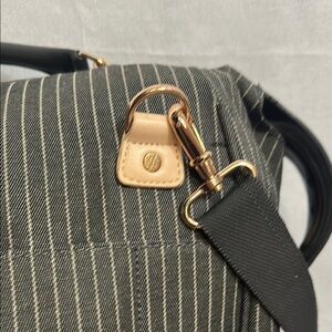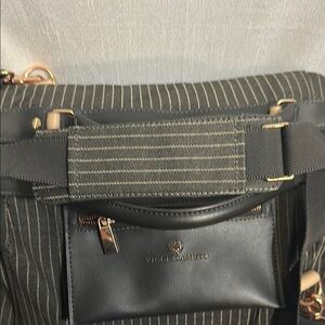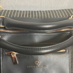 The pristine Vince Camuto Weekender Bag combines sleek style with practical functionality, featuring a sophisticated gray and rose gold color scheme. Its modern design and spacious interior make it perfect for both professional and casual occasions. The adjustable strap ensures comfortable carrying, making it a versatile addition to your accessory collection.