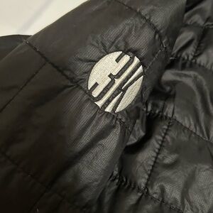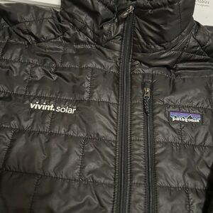 Sleek black quilted jacket by Patagonia. Features a zip-up front and high collar. It says “Vivant Solar because that’s my boyfriend’s old company. It is still a high quality Patagonia coat. The 3K is on the right arm