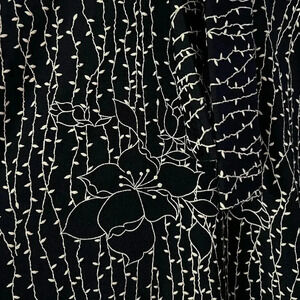 In excellent, clean condition. Black with beautiful gold embroidered vines and flowers. Tie-neck and 3/4 sleeves. Nylon/spandex blend, nice and stretchy.
