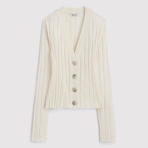 Madewell cardigan sweater featuring a v-neck, mother-of-pearl buttons, a stretchy, wide ribbed construction, and lightweight, soft merino wool/silk blend yarn in a classic off-white shade.
