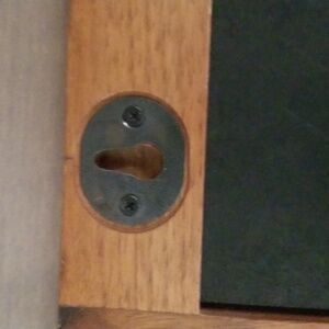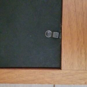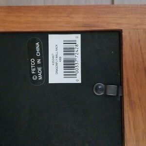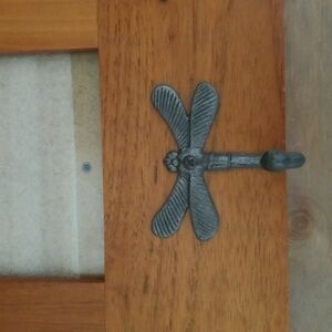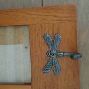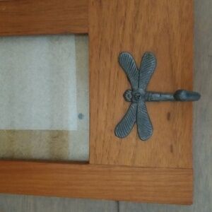 Fetco Wooden Wall Rack featuring three photo slots that hold 4” x 6” photos and three pewter tone metal dragonfly hooks. Removable back with 3 sliding latch fasteners and 2 keyhole hooks for hanging. Glass cover on front. EUC.