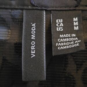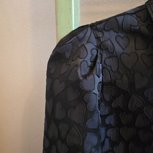 Excellent pre-owned condition. Vero Moda Vigo heart blouse, tonal heart pattern, point collar, button front and cuffs. Size M. 98% polyester, 2% elastane.