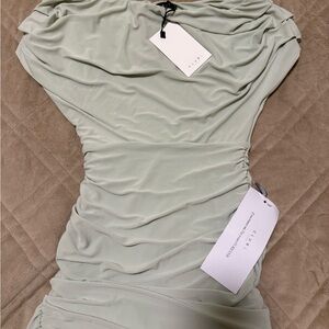 Chic strapless dress in light green. Perfect for elegant occasions. Flattering and stylish design.