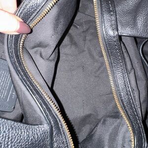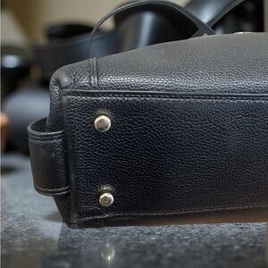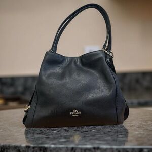 Elegant black leather shoulder bag. Features dual handles. Classic Coach logo detail.