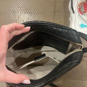Authentic Elegant Gucci bag with black embossed leather. Features tan interior lining. Interior pockets and card places. Gold tone hardware. Very minimal wear on bottom corners, pictured. Comes with dust bag, authenticity cards and receipt