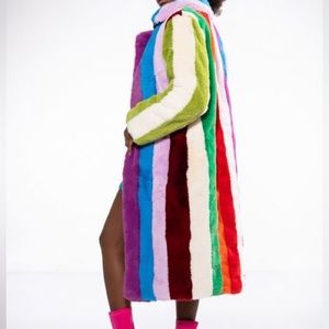 Vibrant faux fur trench coat. Features bold multicolor stripes. Perfect for a statement look.
