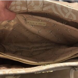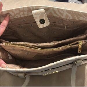 *Copy* Gently used very large tote. Double handled. Large front exterior pocket with snap closure. Large main compartment with snap closure. Interior has a laptop pocket, wall pockets & a zipper pocket. 4 feet. Color Bone 16.5" wide, 12" high & 5" deep * Last two pictures show 2 faint marks