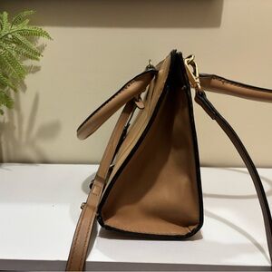 Chic brown satchel with dual handles. Features adjustable strap and gold accents. Small white mark on front and back. Look in pictures to see it, it’s not really noticeable. I haven’t tried to remove it.