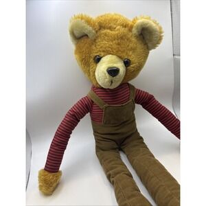 The Knee Hugger Bear Plush is a charming stuffed animal toy from the Interpur brand. This brown corduroy bear is 24 inches long and features cute overalls, making it a delightful addition to any teddy bear collection. Perfect for children and collectors alike, this vintage-style bear is sure to bring joy and nostalgia to all who encounter it. He is missing his hat. Comes from a pet free smoke free home.