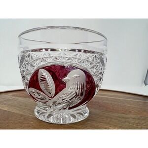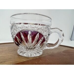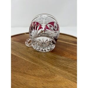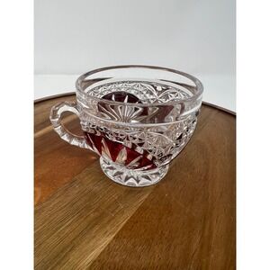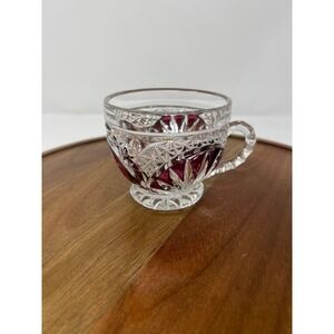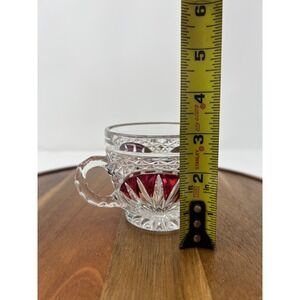 Adorn your table with this exquisite set of six vintage crystal cut teacups, each a miniature masterpiece. Deep ruby red glass is encased within intricate clear crystal cuts, creating a dazzling interplay of light and color with every sip. Delicate floral etchings add a touch of timeless elegance, making these cups perfect for savoring your favorite tea or coffee. The substantial weight and satisfying feel of the crystal promise a luxurious experience.